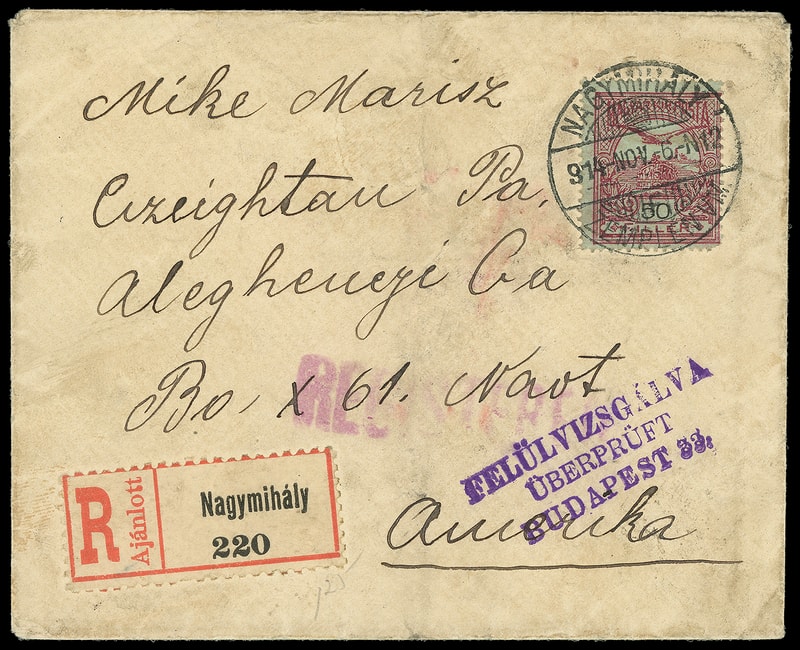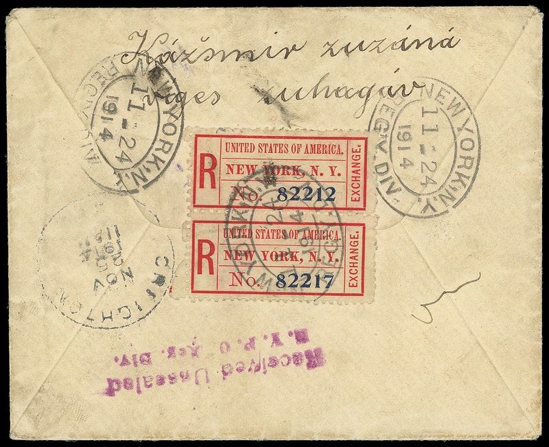 Registry Exchange Label, New York, NY, printed name, vertical pair with blue "82212" and "82217" numbers, affixed to seal flap of 1914 cover from Hungary to Creighton Pa. bearing on Hungary, 50f carmine on blue tied by "Nagyminaly, 14 Nov 6" cds, "R, Nagyminaly" registry label, New York (11.24) transit oval backstamps with one tying exchange label seals, purple "Received Unsealed, N.Y.P.O. Reg. Div." two-line handstamp; some wear and soiling, Very Fine and scarce registered wrapper use.