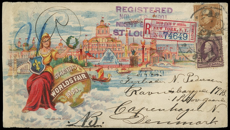 Registry Exchange Label, New York, NY, printed name, overall illustrated St. Louis Mo. World's Fair advertising envelope bearing 3¢ purple (268) and 10¢ orange brown (283) , tied by "St. Louis Mo." ovals, purple "Registered, Nov 19 1901, Night Station, St. Louis Mo." postmark to Copenhagen, Denmark , reverse with New York (11.21) transit and Copenhagen (12.3) arrival backstamp; edge and flap tears, crease at left, F.-V.F.
