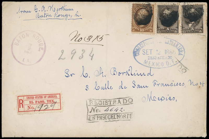 Registry Exchange Label, El Paso, TX, printed name with Gothic letter "R", with ms. "1929" number, affixed on cover bearing 5¢ brown (205) pair and 10¢ brown (209) , tied by cork cancels, purple "Baton Rouge La. Sep 2, 1885" cds to Mexico City, Mexico , framed "Registrado, En Paso Del Norte" registry h.s., blue Mexico City (9.12) arrival oval; edge tears, F.-V.F. and early example.