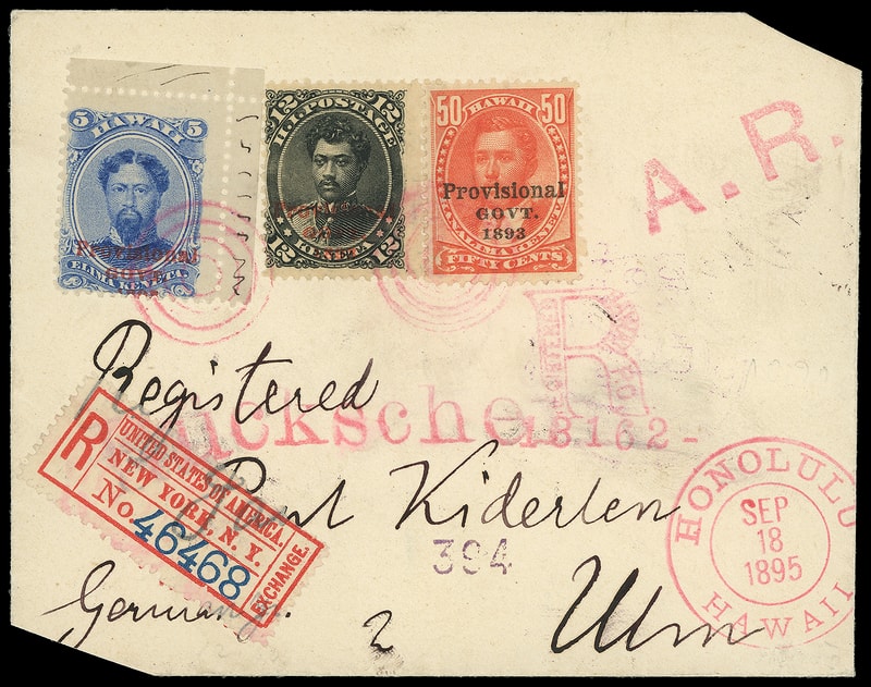 1895 (Sep. 18) Honolulu, Hawaii to Ulm, Germany via New York, cover with corners clipped for fumigation due to cholera epidemic and bearing Hawaii 1893, 5¢ ultramarine (59) corner selvage, 12¢ black, red overprint (62) and 50¢ red, black overprint (72) , tied by red four-ring targets, matching "Honolulu, Hawaii, Sep 18, 1895" cds, "A.R." and Registered R handstamps, purple San Francisco (10.9) and New York (10.15) transit backstamps, New York registry label (NY-FX1a) affixed, Ulm (10.26) arrival backstamp, Very Fine and colorful Hawaii three-color registered use.