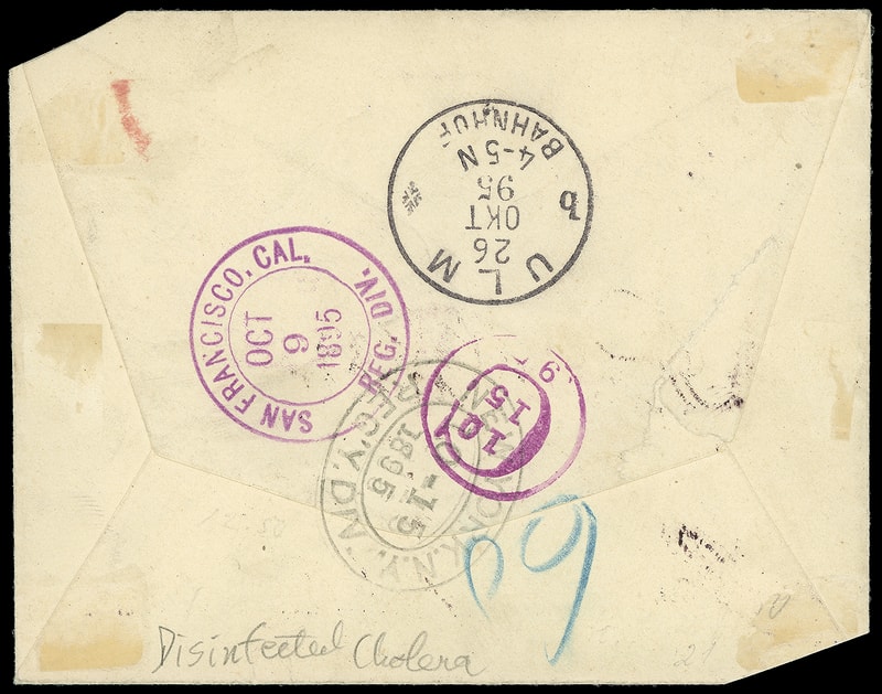 The 1895 Cholera epidemic quarantined Honolulu from August 20, 1895 to October 23, 1895 and mail was fumigated before it could be put aboard a ship bound for another port.Lot 483