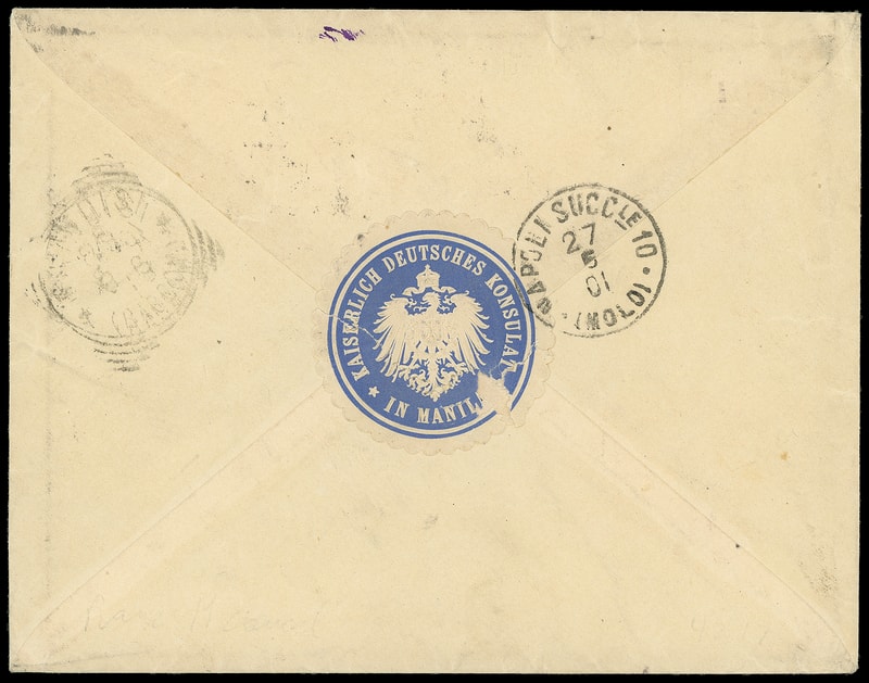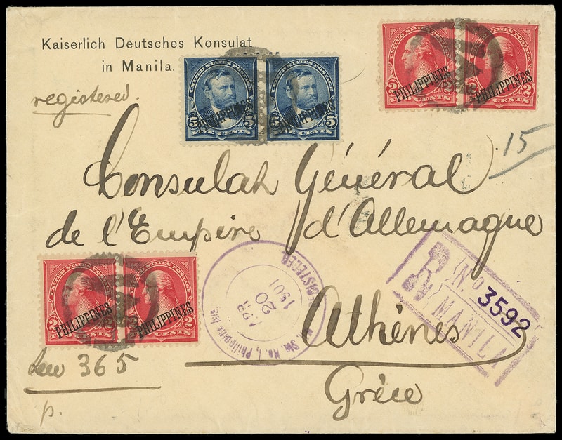 1901 (Apr. 20) Manila, Philippines to Athens, Greece, registered German Consulate imprint cover bearing Philippines, 2¢ red (214) , two pairs, and 5¢ blue (216) pair, each tied by "M" in Circle cancel, purple "Mil. Sta. No. 1, Philippine Isls., Registered, apr 20, 1901" cds and matching "R, No. 3592, Manila" purple handstamp, reverse with "Kaiserlich Deutsches Konsulat" flap seal broken from opeing, Napoli 95.27) transit and, Very Fine.