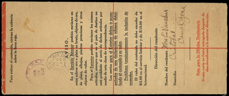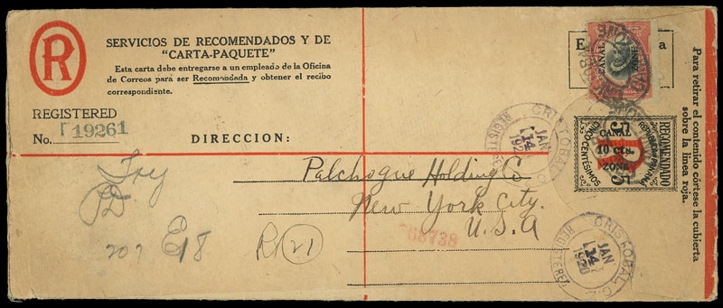 Registration Envelope, 1918, 10¢ on 5c black & red on cream, wide surcharge, Type R2, Size 22 envelope, uprated with 2¢ vermilion & black (32) , tied by "Cristobal, Canal Zone" double-oval, purple "Cristobal, C.Z., Registered, Jan 14, 1920" cds strikes to New York City, Jan. 22nd arrival backstamp; stamp torn from opening, otherwise Very Fine.