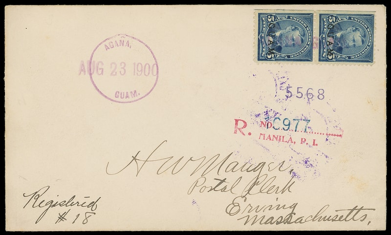 1899, 5¢ Grant, blue, horizontal pair, tied by purple "Aug 23 1900" straightline, second strike with "Agana, Guam." circular postmark on cover to Erving Mass., red "Manila, P.I. R. No………" handstamp, reverse with Manila (9.5) and San Francisco (10.10) transits, fresh and Very Fine registered use.